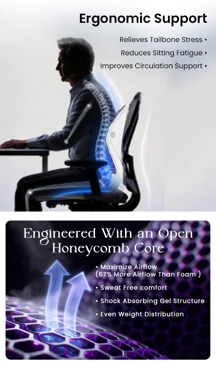 Many users report significant relief from lower back discomfort as the cushion promotes proper spine alignment and reduces pressure points.